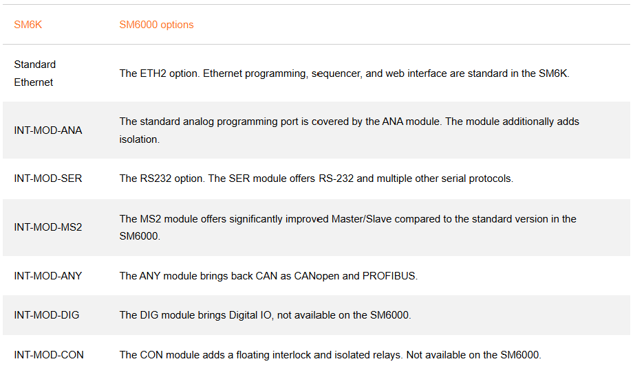 All SM6000 interface options have an equivalent or extended function in the SM6K interface module family. An example of possible interfacing replacements is shown in the table below.
